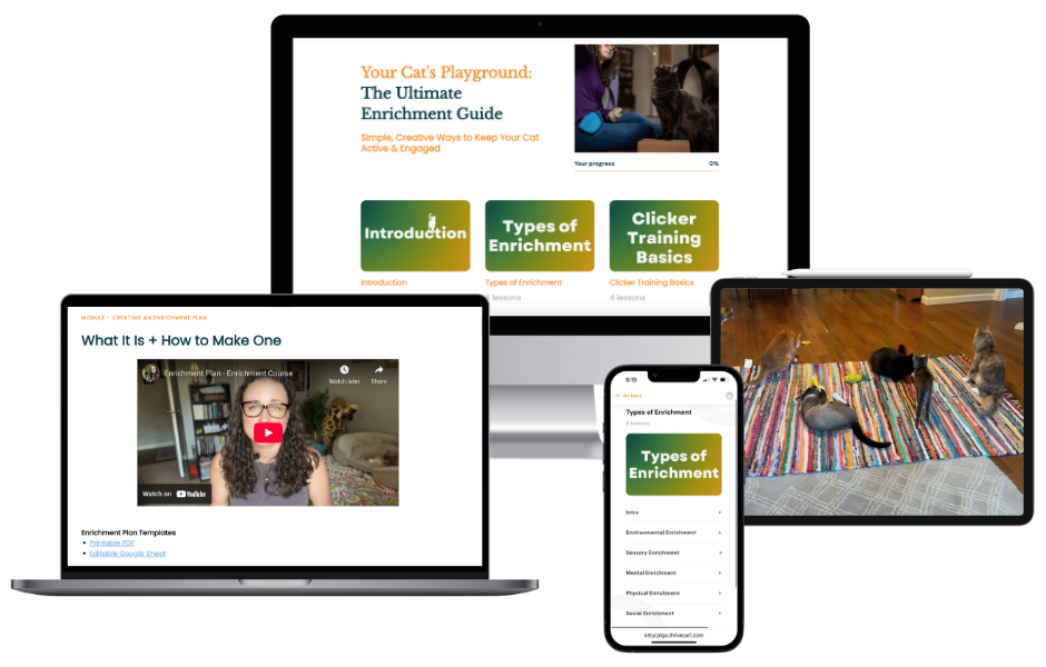 This self-paced video course is packed with step-by-step activities and creative ways to bring joy, excitement, and adventure to your cat’s world — right inside your home and without having to buy a single thing (except maybe treats and catnip, of course).