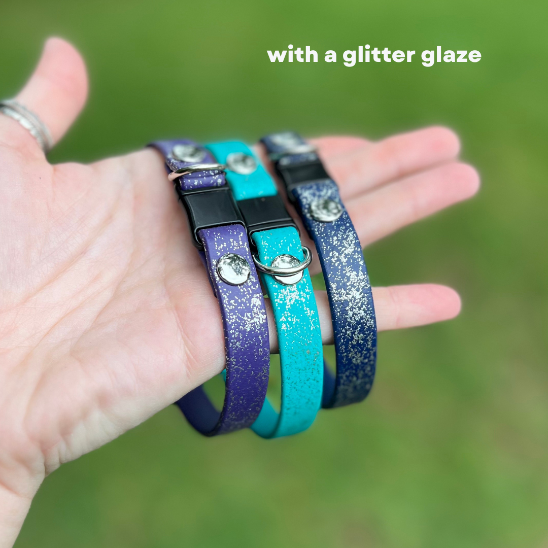 Glitter Glaze is a glazing of silver glitter paint that can be added to the accent pieces of your Kylo Leash or the length of your Kylo Collar.